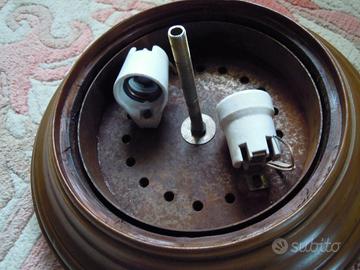 Plafoniera vintage, diametro max. cm. 30, peso kg. 2,5 circa, base in legno, vetro lavorato, punta in ottone, portalampada in ceramica attacchi E27, tutta originale, comprensiva di 2 lampadine, ed in eccellenti condizioni.