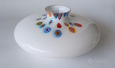 Plafoniera in vetro di murano bianco con murrine colorate. Diametro cm 37, altezza cm 16. Condizioni ottime, nessun segno o rottura .
