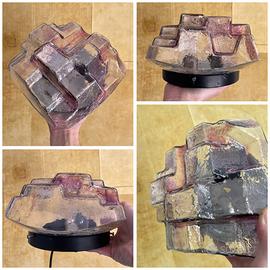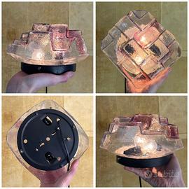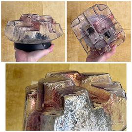 Plafoniera con vetro a forme cubiche sfalsate, con screziature sulle sfumature del rosa e del viola. Quasi glitterata. Ottime condizioni vintage. Ingombro 23×24 cm, sporgenza 15 cm. Stile Mazzega Toni Zuccheri ASVERI l