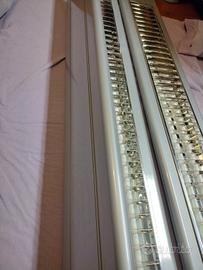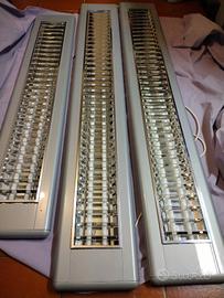 Sono tre plafoniere, una da 135 x 26 cm, due da 165 x 26 cm, dotate di doppio neon e degli agganci e cavetti a soffitto.