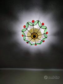 Plafoniera in vetro trasparente con tasselli multicolore, dotata di 6 luci. Diametro 71 cm e profondità 27 cm. Può essere installata a soffitto o a parete. C’è quella più piccola e la piantana. Il prezzo e’ di 800 per piantana, 700 plafoniera grande e 500 la piccola.