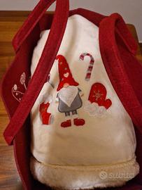 Plaid in flannel con retro in tessuto agnellato, effetto pelliccia, e applicazioni natalizie in rilievo. Il plaid è confezionato all’interno di una borsa in feltro anche con questa con applicazioni in rilievo.