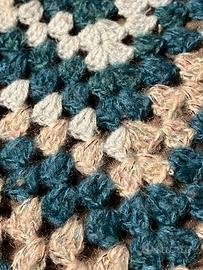 Coperta realizzata a mano all'uncinetto, con un design a quadri che si espande dal centro.