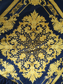 Stupendo plaid double-face in tessuto rasatello di cotone fantasia foulard colore blu e giallo.