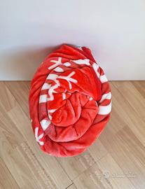Coperta in pile brandizzata Pringles, rossa con stampa logo e motivo fiocchi di neve in bianco. Scritta "Wake me up when winter is over". Misure 180x120 cm. Parte interna bianca morbida in stile lana di pecora.