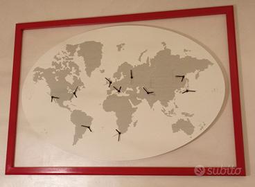 Vendo planisfero (materiale legno) dei fusi orari con orologi funzionanti con pile stilo + cornice rossa in legno. Ottime condizioni
