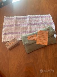 Le pochette sono in vari colori abbinati con spugne di tipo diverso e saponette varie (giapp o artigianali di ottima qualità)