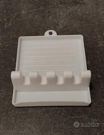 Poggiamestoli, posa mestoli, cucchiai spatole utensili da cucina e coperchi 5 in 1, misure 13x14,5 cm color bianco in materiale plastico antigoccia e lavabile, nuovo ad euro 3,00.
