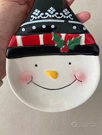 Poggiamestolo in ceramica natalizio, a forma di pupazzo di neve.