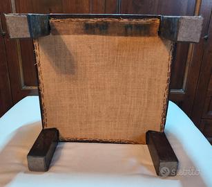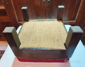 Bellissimo poggiapiedi in legno, con copertura morbida di pelle rossa, fissata con borchie di metallo. Dimensioni 36x36 cm, altezza 29 cm. Per dare un tocco vintage al salotto! È presente una macchia di inchiostro da un lato sulla parte inferiore.