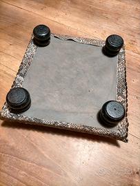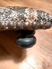 Poggiapiedi vintage rivestito in finto pitone, di forma quadrata, rifinito con borchie in metallo, piedini a cipolla. Dimensioni cm. 29 x 29, altezza cm. 8.