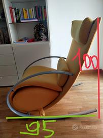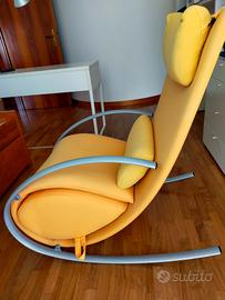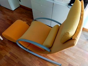 Poltrona in tessuto in ottimo stato , non presenta difetti nella struttura e nell'imbottitura, ha una leggera differenza di colore tra seduta e poggiapiedi.