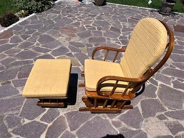 Poltrona a dondolo con struttura in legno color noce, con poggiapiedi a dondolo che segue il movimento della sedia, ideale per allattamento, ma utilizzabile come sedia a dondolo. Cuscini rifatti sia imbottitura che stoffa (con imbottitura più rigida e consistente), completamente sfoderabili e lavabili (come si evince dalle foto). Usata per un anno circa e mantenuta in luogo asciutto.