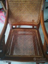 Poltrona indonesiana a dondolo in teack con seduta e schienale in paglia di vienna. Completa di cuscini fatti dal tappezziere. Perfette condizioni. Certificato di autenticità.