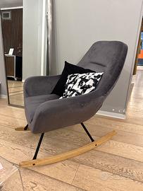 Poltrona a dondolo in velluto grigio, con cambe in legno