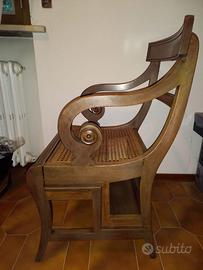 Poltrona sedia da libreria con braccioli a ricciolo e seduta in paglia di Vienna.