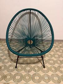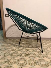 Vendo poltrona dal design moderno e originale, perfetta per arredare con stile qualsiasi ambiente. Struttura in metallo nero con tre gambe robuste, seduta realizzata con fili intrecciati di materiale elastico verde, che offre sia comfort che supporto. La forma inclinata della poltrona garantisce una posizione rilassante e accogliente.