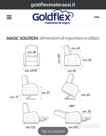 Poltrona usata ma perfettamente funzionante, modello Magic Solution Osaka relax lift 2 motori, con alzata su/giu elettrica, distensione per gambe e schienale reclinabile da 90° a 180° con movimenti independenti. In questa versione i braccioli sono facilmente estraibili, rendendo possibile utilizzare la poltrona sotto un normale tavolo da pranzo. Permette l’elevazione in verticale da 8 cm fino a 17 cm e ha una portata fino a 110 kg. Il suo trasformatore è protetto da schermo antistatico che NON INTERFERISCE con GLI APPARECCHI ELETTRONICI (es. Pacemaker), posiede Dichiarazione di conformità CE per tollerabilità