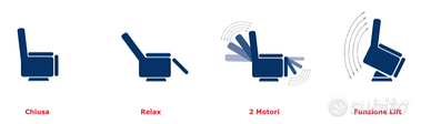 Vendesi poltrona alzapersona elettrica reclinabile Dondi, dotata di doppio motore e roller system per agevolare gli spostamenti, perfettamente funzionante. Misure chiusa: H 105, P 100, L 85. Presenza di scalfittura, come da foto. Da ritirare in loco.