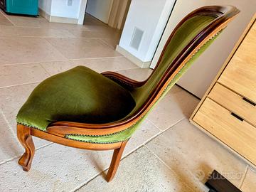 Caratteristiche: splendida poltrona anni '20 realizzata in noce massello con rivestimento in velluto verde muschio scuro su seduta, schienale e parte posteriore dello schienale. Sostegni sagomati, profilo filettato. Comodissima, dalla linea sinuosa e avvolgente, poltrona elegante e raffinata, adatta sia ad arredamenti antichi che moderni.