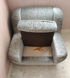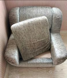 Vendo poltrona con rivestimento in tessuto, pezzo di vecchio arredo anni Ottanta, colore grigio e nero. Ancora comoda e funzionale, sempre pulita e trattata con filtro antiacaro. Unico difetto piccola lacerazione nel tessuto sotto il cuscino, visibile in foto ed eventualmente riparabile con facilità. Misure: larghezza cm 100; lunghezza cm 100; altezza cm 80.