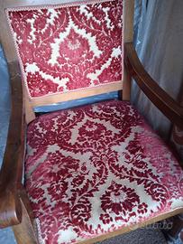 Vendo poltrona antica, in buone condizioni, con struttura in legno massello, rivestimento in tessuto damascato rosso e beige. Prezzo ribassato a 40€.