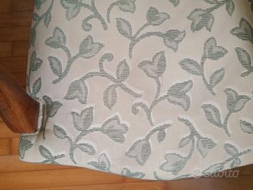 Poltrona antica del '900 restaurata, in tessuto floreale bianco e verde. Ottimo stato, salvo alcuni piccoli aloni nel bracciolo destro (come da foto) e un alone nella seduta (come da foto).