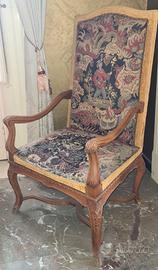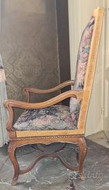 Poltrona "arazzo" in stile Luigi XIV in legno massello modellato e intagliato, presenta un alto schienale a cappello di gendarme e una seduta ampia e profonda.