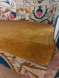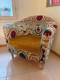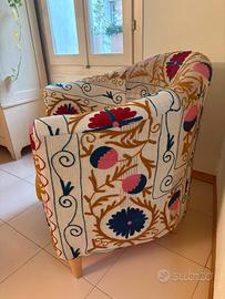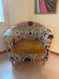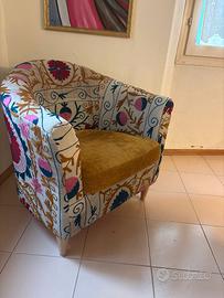 Poltrona artigianale sartoria indiana rivestita a mano. Sari indiano e cuscino centrale in velluto