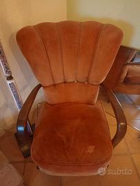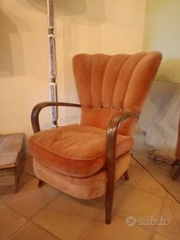 Poltrona antica a forma di conchiglia. Buono stato. Presenta una macchia sul cuscino.