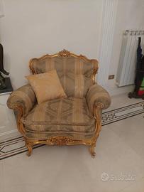 poltrona in seta di san Leucio, con rifiniture dorate.