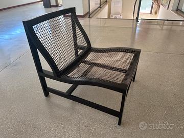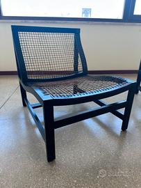 Poltrona bassa in legno e rete L 61 P 74 H 70 (schienale) H 37 (seduta). Disponibilità 2 pezzi. Prezzo € 170 cadauna. Ritiro a mano zona Ascoli Piceno oppure disponibile a spedire