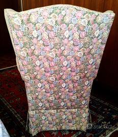 Questa deliziosa poltrona bergére della metà del '900, è stata restaurata e rivestita con una nuova tappezzeria damascata a motivo floreale alla fine degli anni '90.