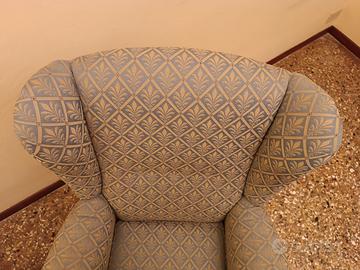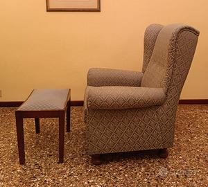 In ottime condizioni, solo qualche macchia sui braccioli (vedi foto) e un piccolo foro di tarlo sul poggiapiedi, facilmente rimediabile.