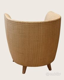 Poltrona usata ma in ottimo stato di conservazione, piccoli segni di normale uso sulle parti in vimini.