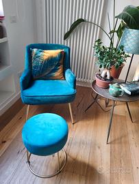 Vendo splendida poltrona in velluto blu pavone con poggiapiedi coordinato, perfetta per creare un angolo di relax con stile!