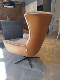 Le linee avvolgenti, lo schienale alto e la base girevole in metallo nero la rendono ideale per living eleganti, zone lettura o ambienti contract di alto livello.