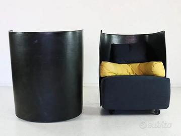 Poltrona Campiello 880 vintage (anni '80), Zanotta. Dotata di 2 ruote frontali, si caratterizzata dallo schienale rigido, ricurvo, ampio, e avvolgente, in multistrato di legno ricoperto in cuoio Toscano nero con sedile in poliuretano, poggiareni rosso/giallo e cuscino nero entrambi in tessuto. Il tessuto è MORBIDO. Un’ opera d’ arte del design made in Italy degli anni ‘80. Per collezionisti ed intenditori. Un autentico pezzo vintage che si distingue per il suo look originale e le forme uniche