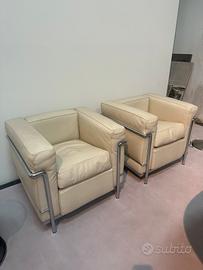 Coppia di poltrone LC2, un prodotto esclusivo e di altissima qualità in sabbia ecru, progettata da Le Corbusier e prodotto da Cassina. Presenta una struttura in acciaio cromato.