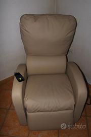 Poltrona chaise longue con meccanismo relax, elettrica, alzata assistita ,poggiapiedi, ruote comode per spostarla e blocco a pedale. Pelle crema. Completa di libretto di istruzioni. Come nuova perché usata sempre con copripoltrona. Rivestimento perfetto. Copripoltrona incluso insieme libretto di istruzione