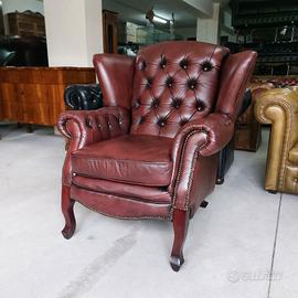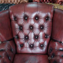 Poltrona chesterfield bergere originale inglese in vera pelle marrone che tende al rosso.
