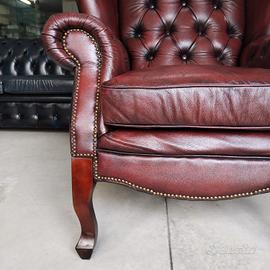 Confortevole poltrona chester chesterfield modello bergere vintage inglese originale in pelle marrone anticato.