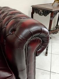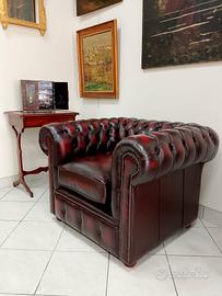Nuova e iconica poltrona chesterfield ( chester ) modello club inglese originale realizzata artigianalmente in Inghilterra con pelle bovina di pieno fiore rosso bordeaux anticato, tamponata e stonalizzata a mano.