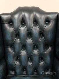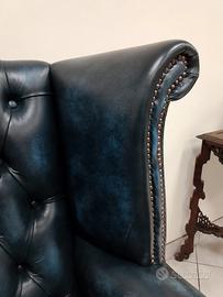Nuova poltrona chesterfield ( chester ) modello Queen Anne inglese originale realizzata artigianalmente in Inghilterra secondo la tradizione chester inglese con soffice pelle bovina di pieno fiore blu petrolio ( Antique blue ).
