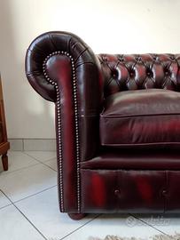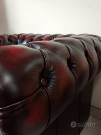 Nuova e originale poltrona chesterfield ( chester ) modello club realizzata artigianalmente in Inghilterra secondo la tradizione chester inglese, con soffice pelle bovina di pieno fiore bordeaux anticato ( Antique Red ) tamponata e stonalizzata a mano. Nella fodera sottostante il cuscino è cucito il certificato di autenticità.