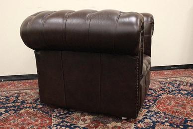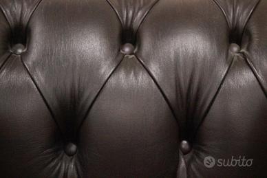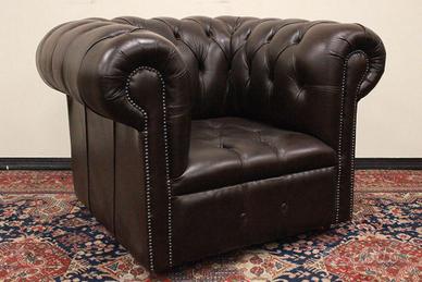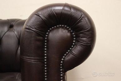 Poltrona Chesterfield club in pelle marrone scuro originale Made in UK. Chesterfield è un nome inglese che è garanzia di qualità. Questa degli anni ’90 circa (vintage), è un modello club (dallo schienale basso) in pelle marrone scuro. L’imbottitura decorata dalla caratteristica lavorazione capitonné presente sia sullo schienale che sulla seduta, la caratteristica forma bassa e i materiali pregiati, fanno di questo oggetto non solo uno splendido pezzo di design, ma anche un comfort per abbellire e rendere elegante qualsiasi ambiente. Degno di nota è il cuscino fissato alla poltrona e costituito da un unico lembo di pelle. Misure: Larghezza 103 cm – Profondità 90 cm – Altezza 75 cm. Per ulteriori informazioni contattateci ai seguenti numeri: Sig. Alessandro 340/1941515 Sig. Franco 333/6035965