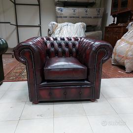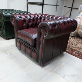Poltrona chesterfield club originale inglese in vera pelle rosso bordeaux anticata.