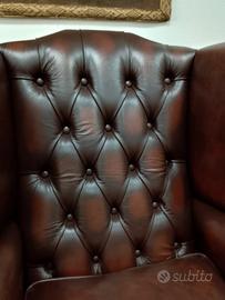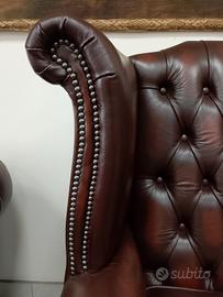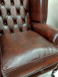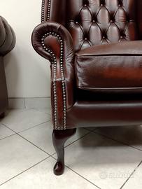 Nuova poltrona chesterfield ( chester ) modello Queen Anne in pelle bovina di pieno fiore marrone anticato ( Antique Brown ) realizzata artigianalmente in Inghilterra secondo la tradizione chester inglese. Nella fodera sottostante il cuscino è cucito il certificato di provenienza.