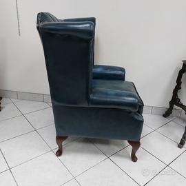 Poltrona chesterfield Queen Anne originale inglese in vera pelle blu petrolio nuova.