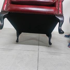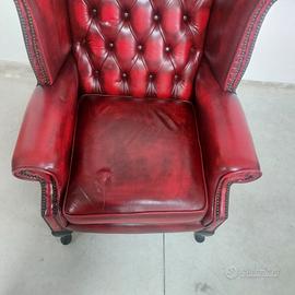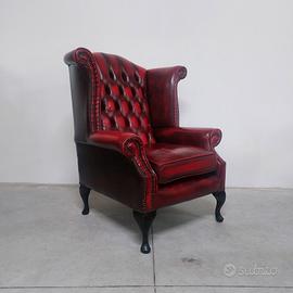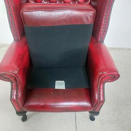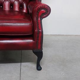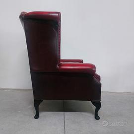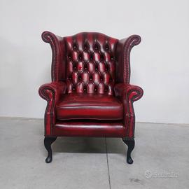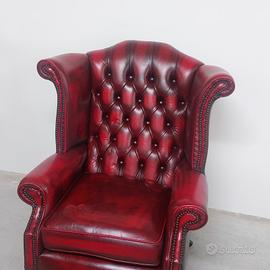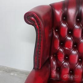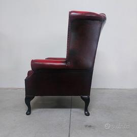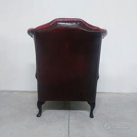 Poltrona chesterfield Queen Anne originale inglese vintage in vera pelle rosso bordeaux.